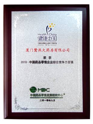 由中國藥品零售發展研究中心(MDC)、中國醫藥企業合作與發展組織(CPEO)、中國藥品品牌評審委員會主辦的“健康中國?2010中國藥品品牌評選活動”,經過為期半年的品牌征集、品牌入圍和專家評選階段,于6月21日公布了“健康中國?2010中國藥品品牌榜”榜單,鷺燕大藥房榮登“健康中國?2010?中國藥品零售企業綜合競爭力百強”企業。 |